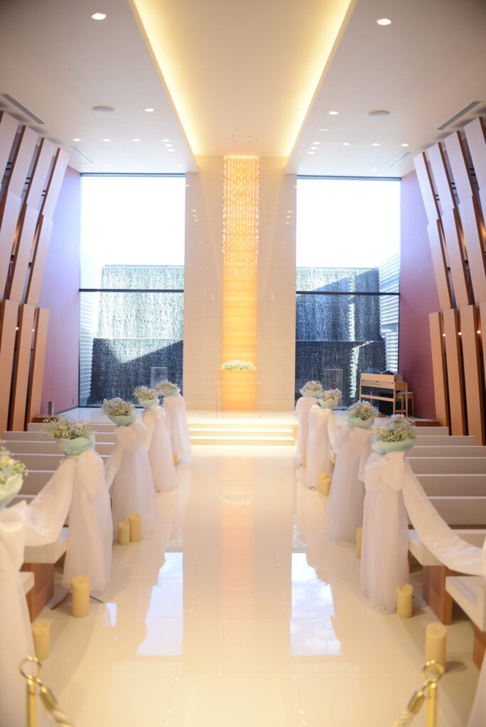 セレモニー会場は、かすみ草とパステルのお花、レース・キャンドルを使用し、