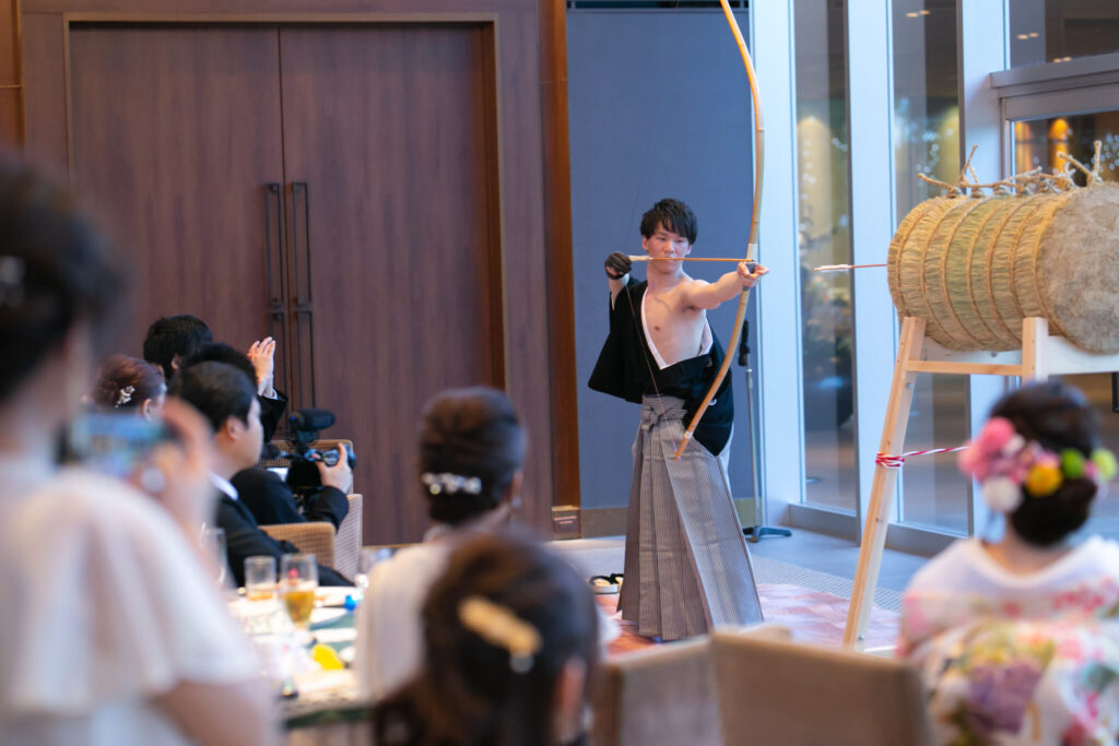 披露宴の後半には、新郎様が習っていた弓道を披露する場面も![]()