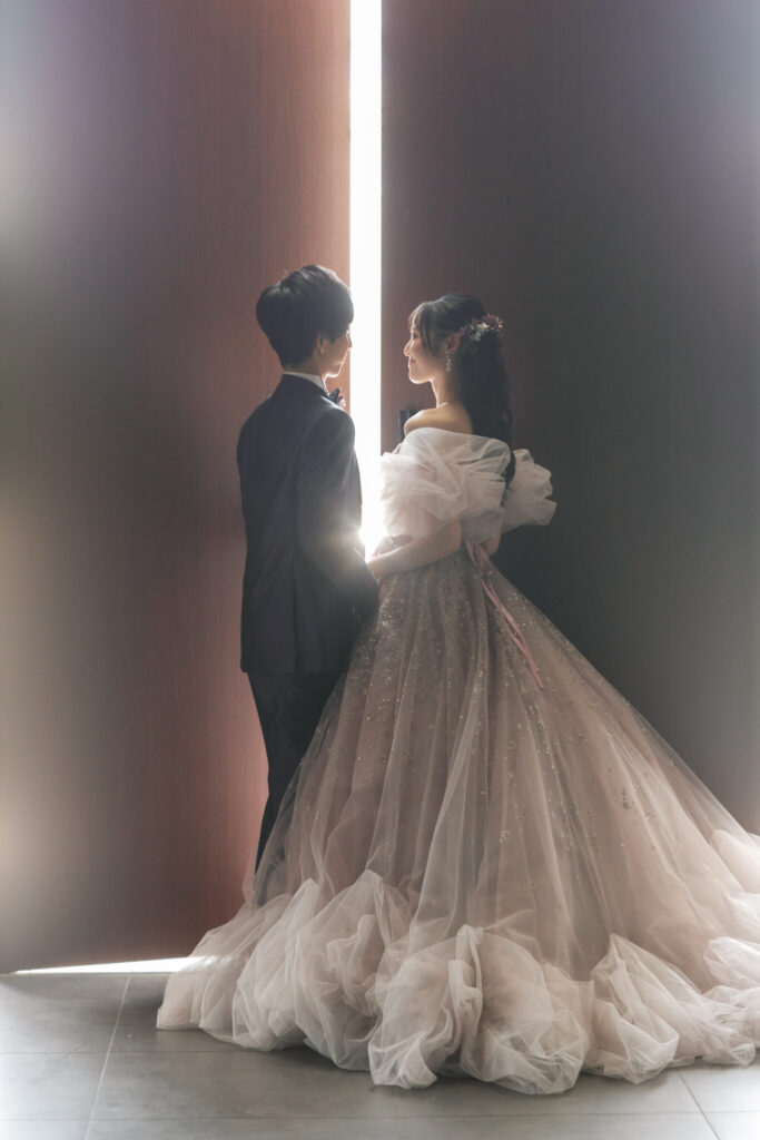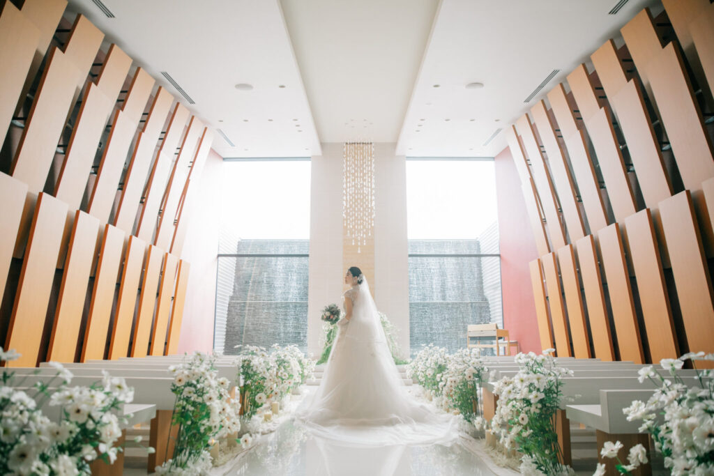 チャペルから出たところに広がるホワイエは、照明を落とした落ち着いた空間ですが、窓や扉から差し込む光がきれいで、おしゃれなお写真を残していただけます。