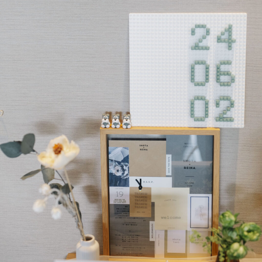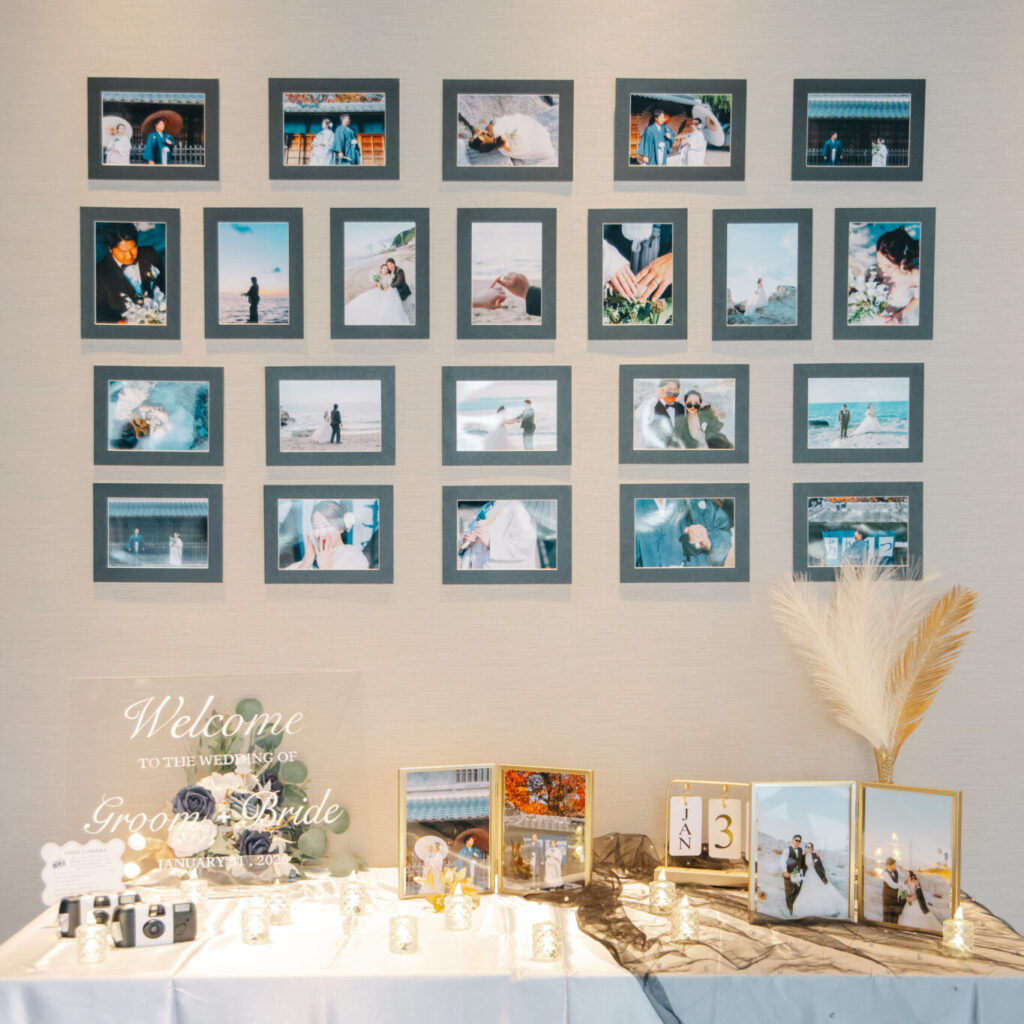 ウェルカムスペースに飾った前撮りのお写真も、海や青の紋服が映えてきれいでした!