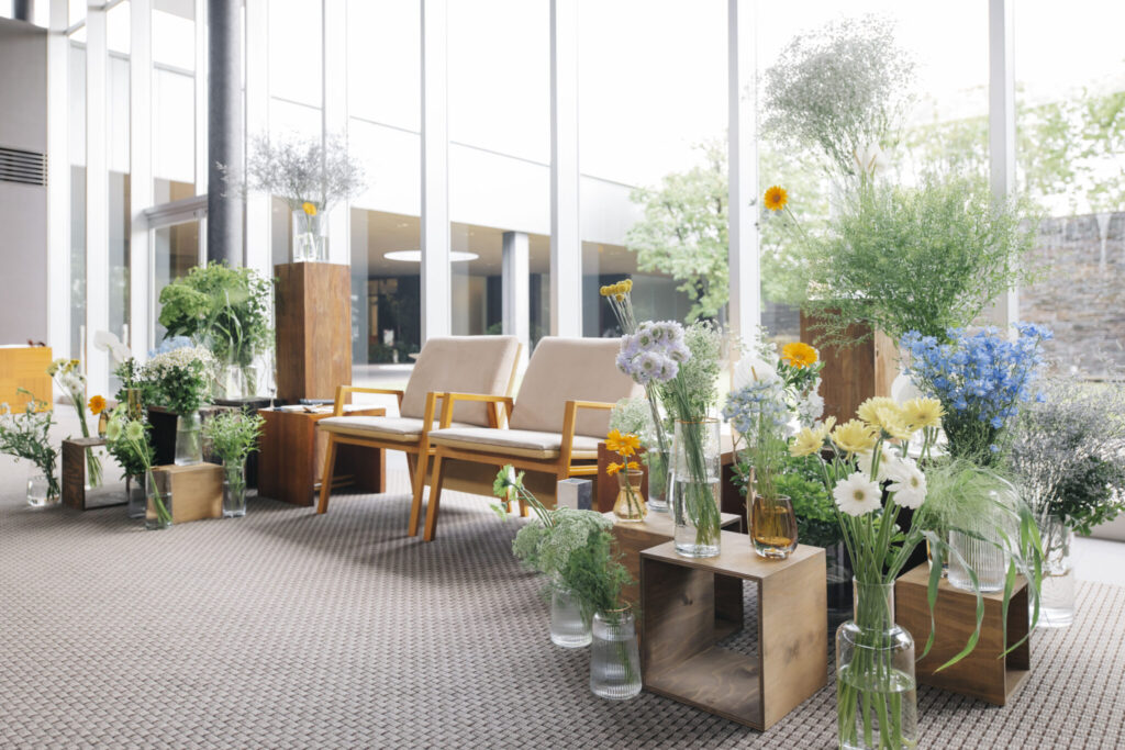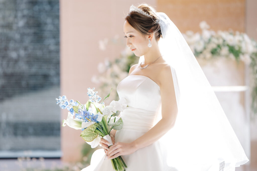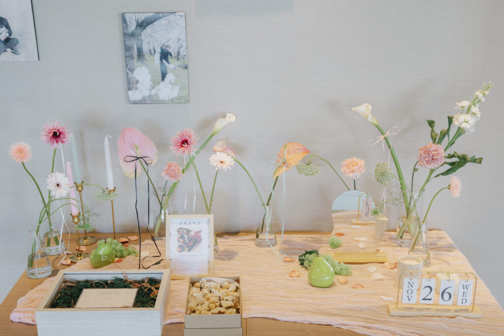 お衣装に合わせたテーマカラーを決めて、会場装花やウェルカムスペース、ケーキや演出にも統一感を出すと素敵!