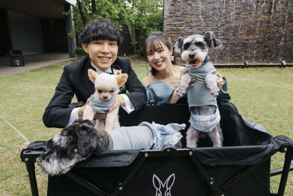 わんちゃんたちの服もカラードレスとお揃いの色にしたんです![]()
